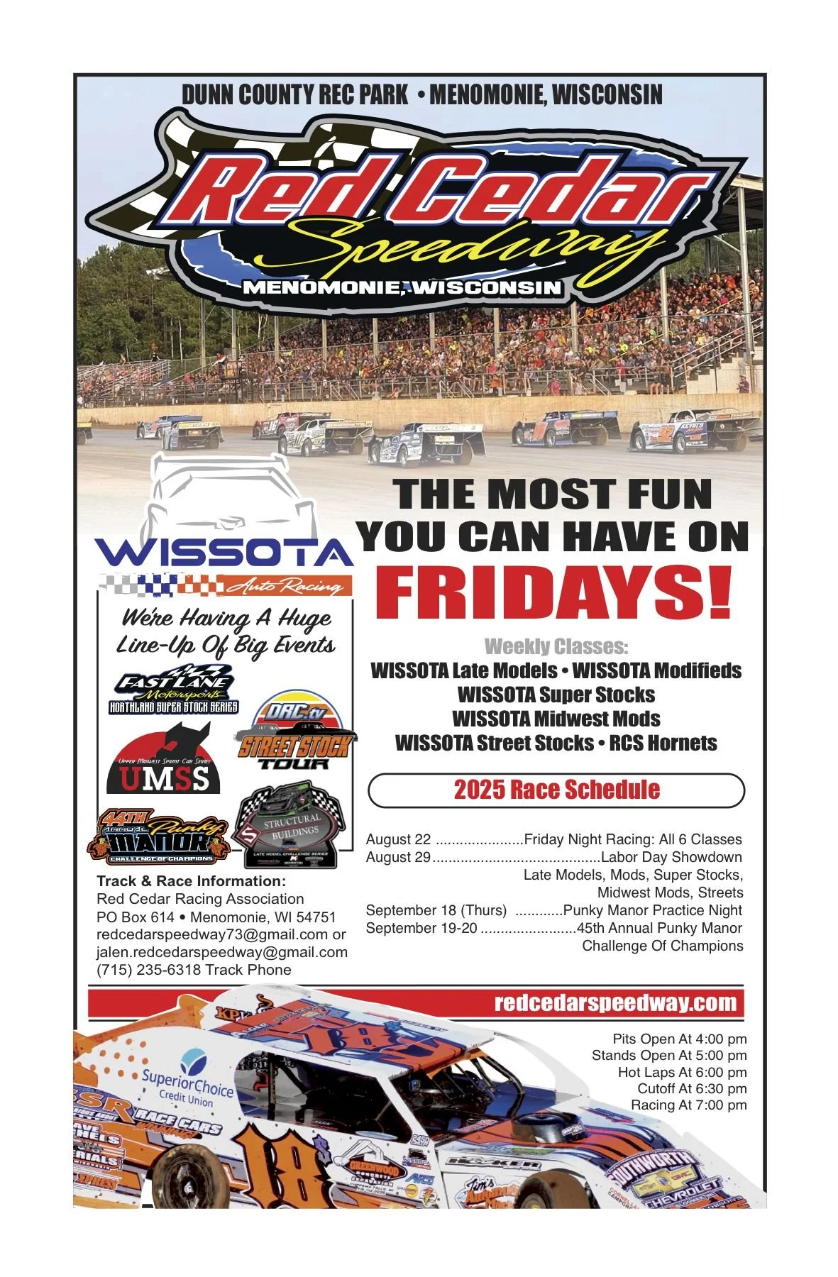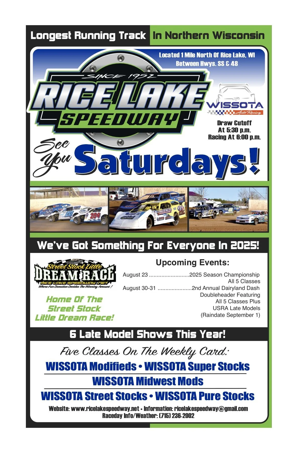 Looking ahead to the end of the month, the second annual Dairyland Dash will be held at the speedway on Saturday, August 30, and Sunday, August 31. Five WISSOTA classes will be in action including the Pure Stocks, Street Stocks, Midwest Modifieds, Super Stocks and Modifieds. The USRA Late Models will also be racing that weekend, with all six classes running full racing programs on both Saturday and Sunday.
