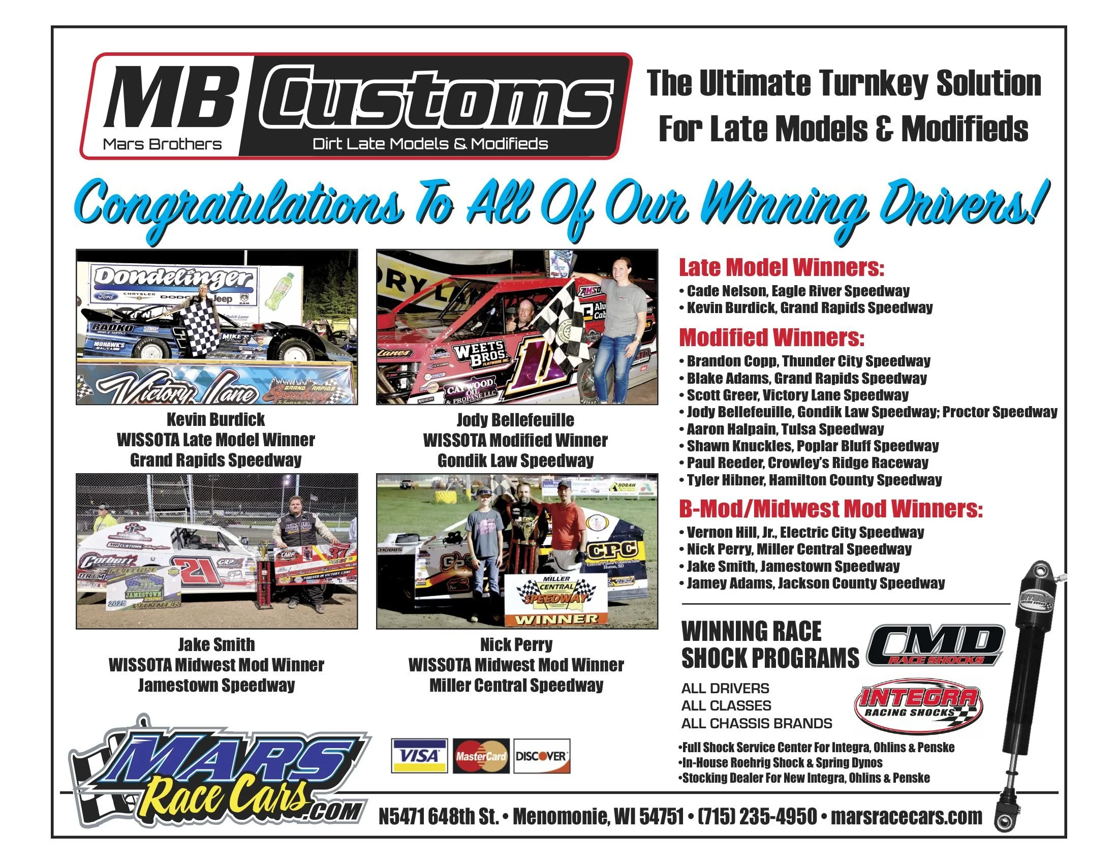 B-Main (12 Laps): 1. 10C-Chad Olsen[1]; 2. 1-Ryan Engels[3]; 3. 57-Chad Williamson[2]; 4. 37JR-Morgan Ward Grosz[6]; 5. 5L-Dustin Larson[5]; 6. 73M-David Carlson[8]; 7. 87-Curt Kranz[9]; 8. 16-Thomas Weisgram[13]; 9. 14N-Nick Schmidt[10]; 10. 07B-Corey Bosma[11]; 11. (DNF) 73-Larry Fitzsimmons[4]; 12. (DNF) 748-Kyle Jensen[7]; 13. (DNF) 71-Mike Benson[12]; 14. (DNF) XA-Alissa Palsrok[14]